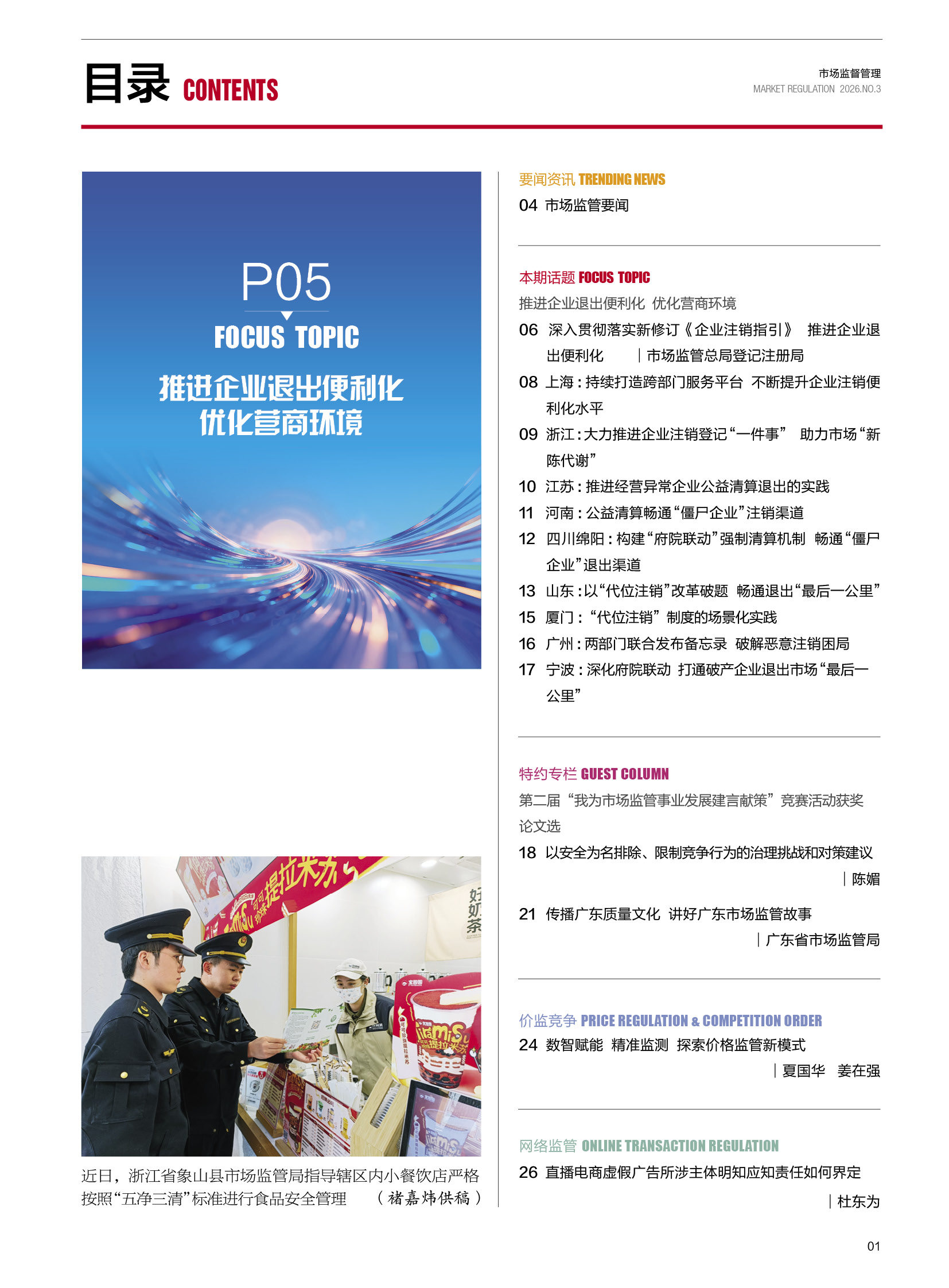 为深入贯彻新修订的《公司法》和《公司登记管理实施办法》,落实党中央、国务院完善经营主体退出制度和推进“高效办成一件事”的工作要求,市场监管总局会同公安部、人力资源社会保障部、中国人民银行、海关总署、税务总局等6部门对《企业注销指引(2023年修订)》进行专项修订,形成《企业注销指引(2025年修订)》。为提升企业退出便利化水平、优化营商环境,助力经营主体高效有序退出市场,本专题聚焦企业退出环节的痛点、难点、堵点,约请市场监管总局登记注册局对《企业注销指引(2025年修订)》进行权威解读,明晰注销流程与操作规范,并约请上海、浙江、江苏、河南、四川、山东、厦门、广州、宁波等地市场监管部门分别就开展企业注销登记“一件事”改革的先进经验,开展强制清算、府院联动的创新探索,以及通过“代位注销”破解经营主体退出难题的创新实践进行撰文,以期为更好地开展工作提供借鉴。